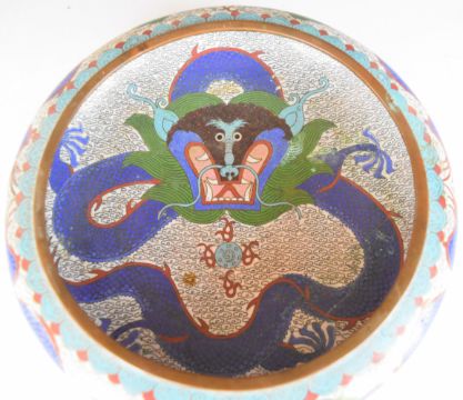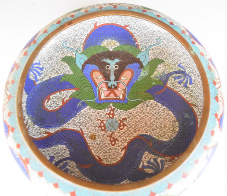 Chinese cloisonné bowl decorated with dragons, with four character mark to base, 26cm in diameter.