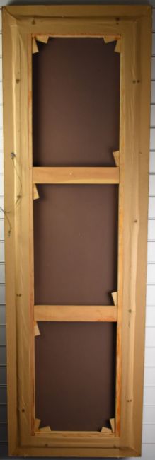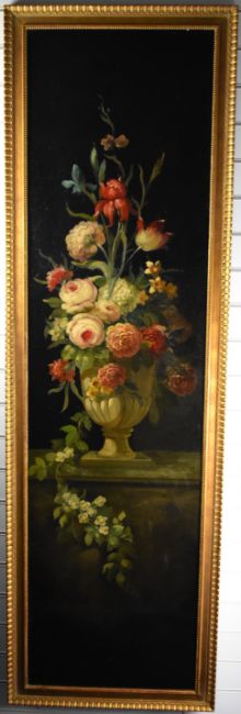 Pair of large oil on board still life studies of flowers in vases, in gilt frames, 202 x 63cm overall