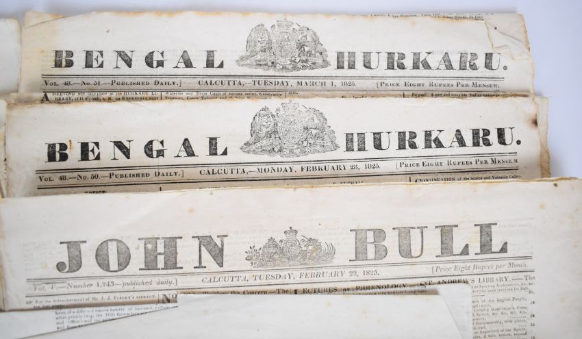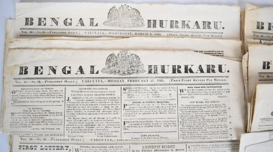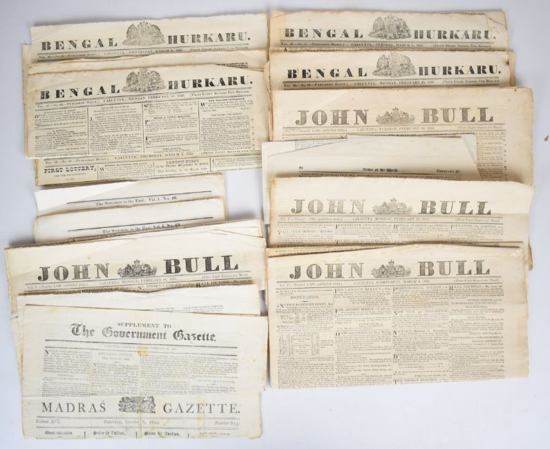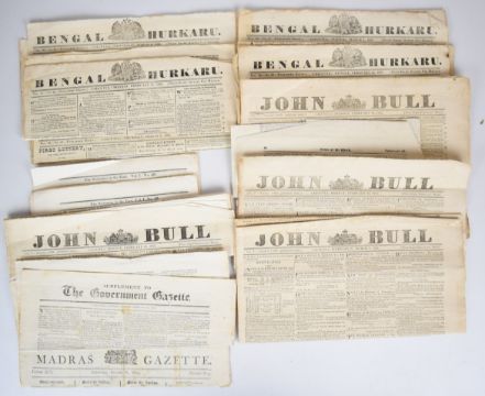 Approximately 12 Georgian Indian newspapers, mostly Calcutta, including Bengal Hurkaru 1825, The Scotsman in the East 1825, Madras Gazette 1810, John Bull 1825 and Government Gazette 1825