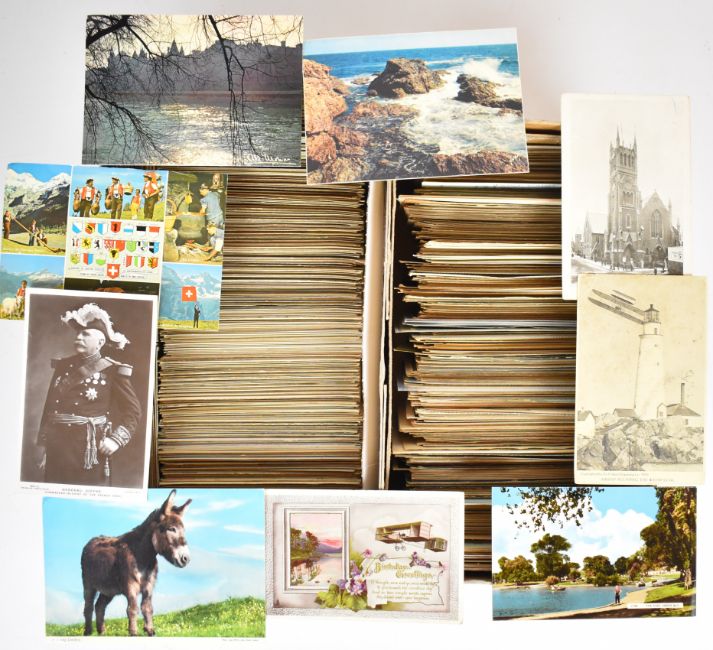 Approximately 1800 Edwardian and later postcards including tennis, Cheapside, London, Westcliff on Sea, Torquay, Woolwich, Gravesend, York, Aldershot, Plymouth, Bath, Manchester, Osbourne House, Isle of Wight, aircraft including flying boats, De Havilland and early aviation