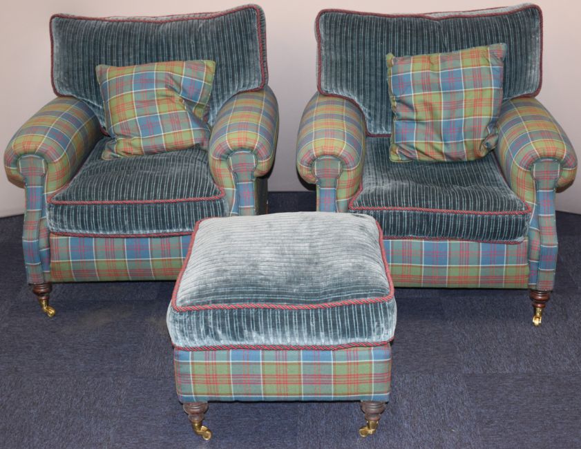 Pair of Victorian style upholstered armchairs and matching footstool, with cord cushions and rope twist piping, width of each chair 88cm, depth 90cm