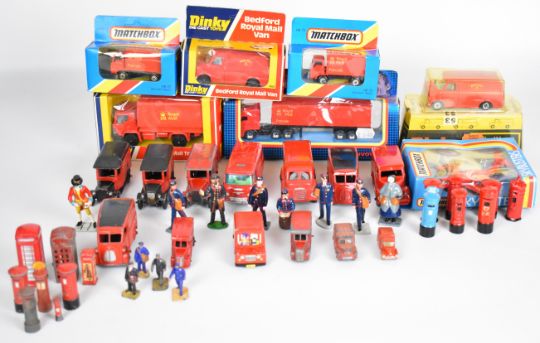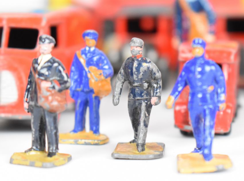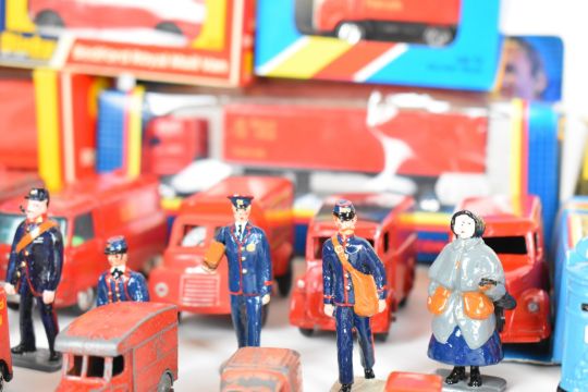 A collection of Royal Mail related toys to include vintage Dinky diecast model cars, together with a group of Britains style lead figures.