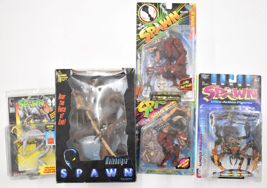 Five early Spawn action figure by McFarlane Toys to include The Violator, The Mangler and The Vandalizer, all in original packaging