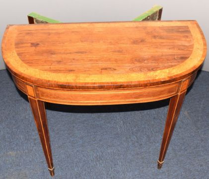 Georgian or early Victorian rosewood and pollard oak or similar fold over card table, W91 x D45 x H73.5cm