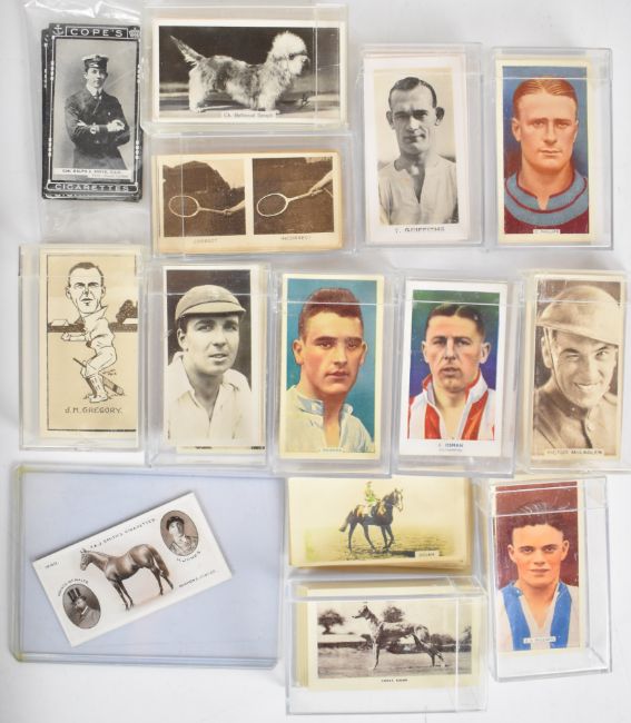 Large collection of cigarette and trade cards in two trays including Hills, Abdullah, Churchman, Turf, Godfrey, Phillips, Hignetts, John Sinclair, Sunripe, Bocnal, Carreras, Franklins, Major Drapkin, Kings, Morris, F & J Smith, Chairman Juniors, Copes etc subjects include gold, cricket, football, speedway, horseracing, jockeys, rugby, etc