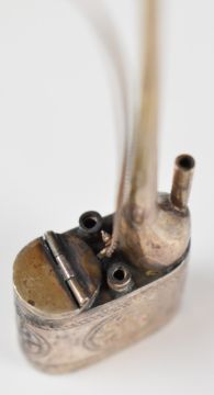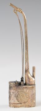 Chinese silver miniature opium pipe with embossed decoration and marks to base, 9cm tall.