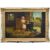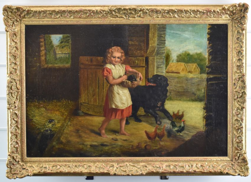 19th century oil on canvas girl in a stable carrying a puppy in a basket with the mother following alongside, 39 x 59cm, in ornate gilt frame