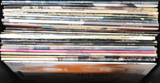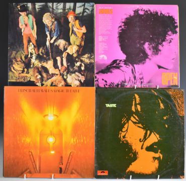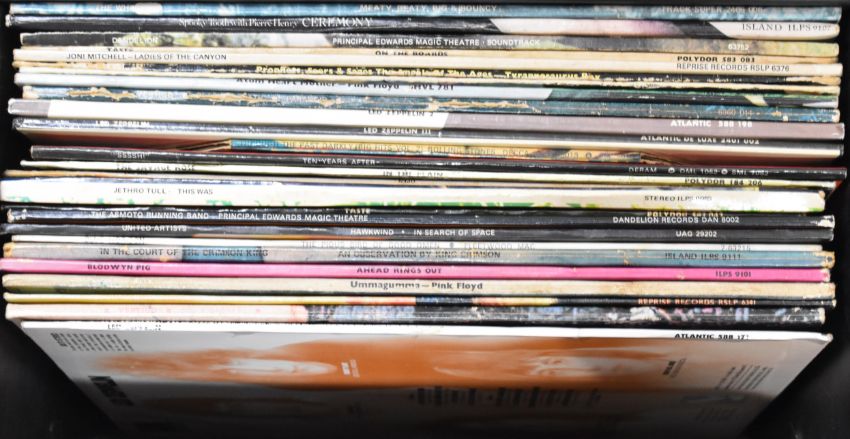 A collection of 26 albums including Led Zeppelin (3 plum), Black Sabbath (2 swirls), Pink Floyd, Taste, Principal Edwards Magic Theatre, Spooky Tooth, Jethro Tull, Julie Driscoll / Brian Auger, King Crimson, Tyrannosaurus Rex, Blodwyn Pig, Hawkwind (with log), Fleetwood Mac, Joni Mitchell, Ten Years After, The Rolling Stones, The Who, The Savage Rose etc