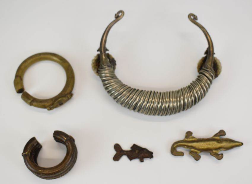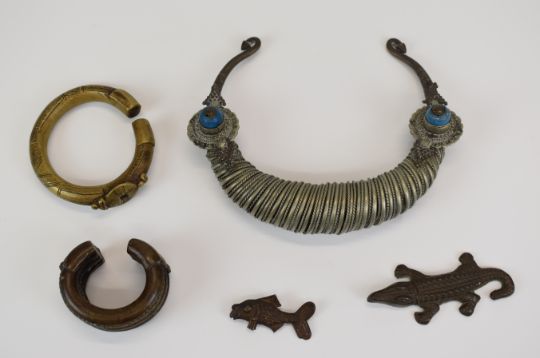 A collection of tribal jewellery including Ashanti gold weights formed as a fish and a crocodile