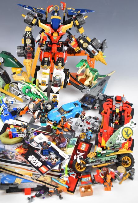 A collection of Lego kits including Technic, Jurassic World, The Avengers, Ninjago, Star Wars and City, with instruction manuals.