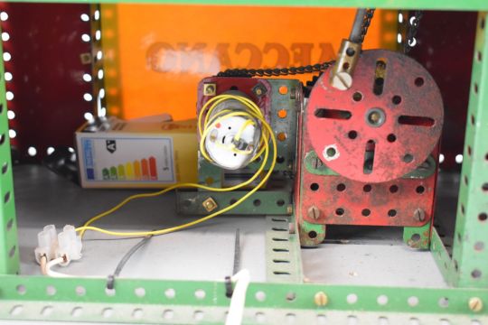 Meccano motorised shop display digger or low loader tractor, raised on illuminated base, 38 x 25.5 x 32cm