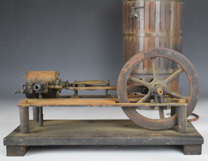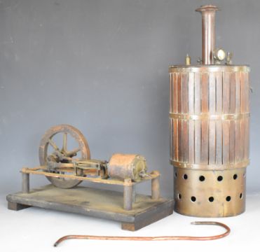19thC or early 20thC live steam horizontal mill engine together with a wood and brass clad copper vertical boiler with pressure gauge, overall height 45cm