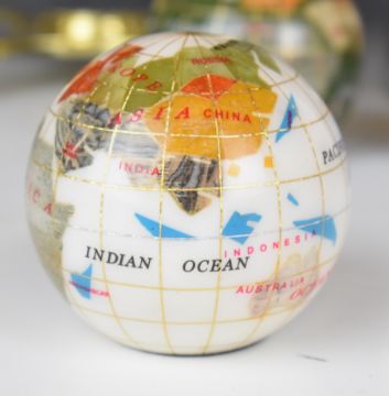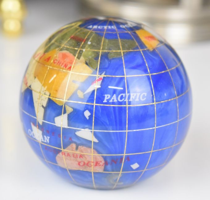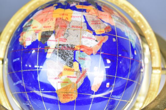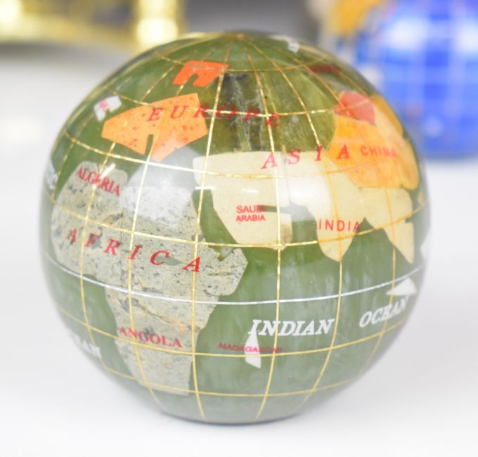 Five pietra dura globes comprising two on stands, one with clock, thermometer and hygrometer and another with compass to the base, height of tallest 22cm