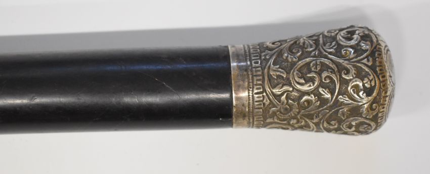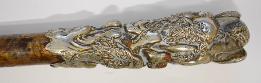 Two walking sticks with white metal finials, one Indian with embossed scrolling decoration the other Chinese featuring an eagle and a monkey.