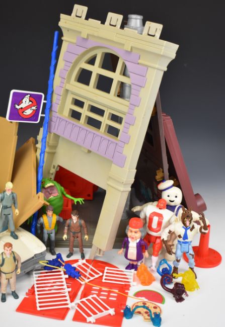 A collection of The Real Ghostbusters figures and playsets by Kenner to include Fire Station, Ecto-1, Slimer, Stay Puft Marshmallow Man, Venkman, Stanz etc.