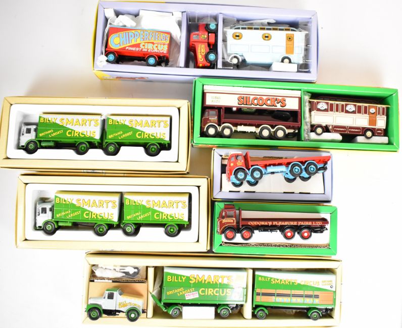 Seven Corgi diecast model circus and showman's vehicles to include ERF 8 Wheel Rigid Truck 97957 and AEC Mercury Truck with Trailer 97891, all in original boxes.