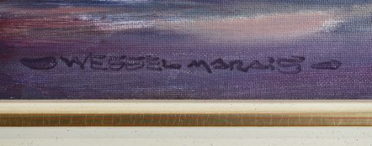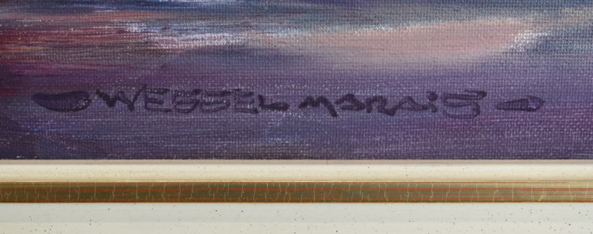 Wessel Marais (South African 1935-2009) oil on canvas group at a table beside a whitewashed house in trees, signed lower right, 60 x 90cm, in ornate gilt frame
