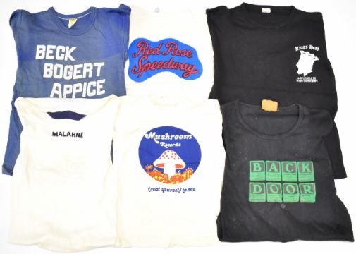 A collection of Rock / Pop promotional T shirts / clothing comprising Paul McCartney & Wings Red Rose Speedway, Splinter 77 Europe tour, King Harvest Has Surely Come, Shepperton Studios, Pilot Second Flight, Kings Head Fulham, Three Dog Night, Malahne, George Benson, Mushroom Records (Treat Yourself to One), Capitol Records, Aquarius and Beck Bogert Appice, most size S. From the estate of music journalist Miranda Ward