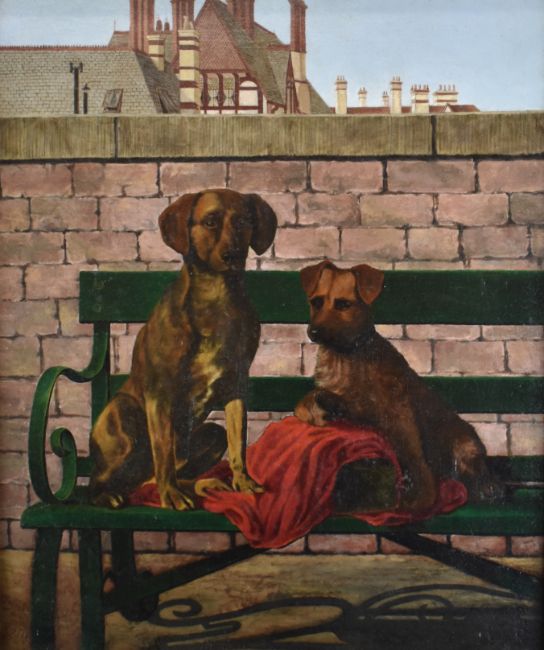 Victorian oil on canvas of two dogs on a bench with house beyond, monogrammed WR and dated 1900 lower left, 75 x 62cm, in gilt frame