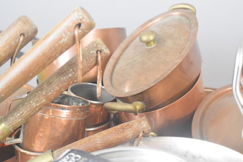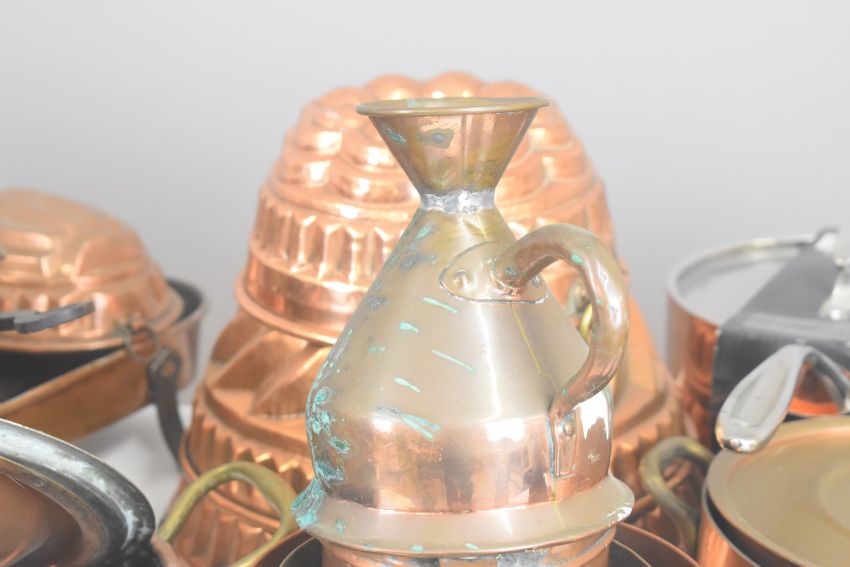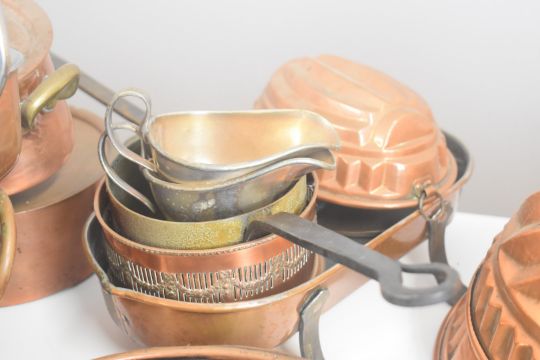 Approximately fifty pieces of copper and similar kitchen ware including jelly moulds, frying pans, pan lids etc, length of largest 47cm