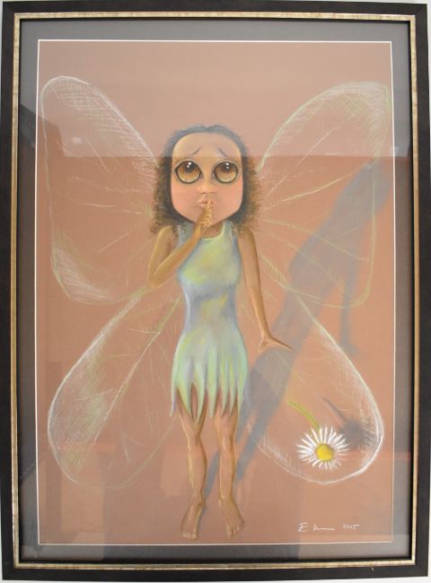 Modern novelty pastel study of a fairy with her finger to mouth, signed and dated 2015, 66 x 46cm, in stained and silvered frame