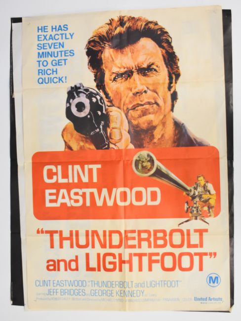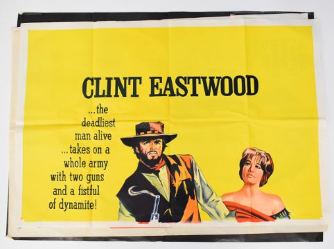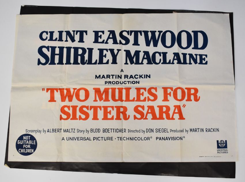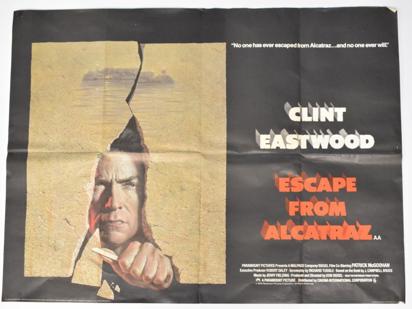 Four Clint Eastwood cinema display advertising posters Escape From Alcatraz, Thunderbolt and Lightning, Two Mules For Sister Sara and a large two part Spaghetti Western poster, largest 130 x 100cm