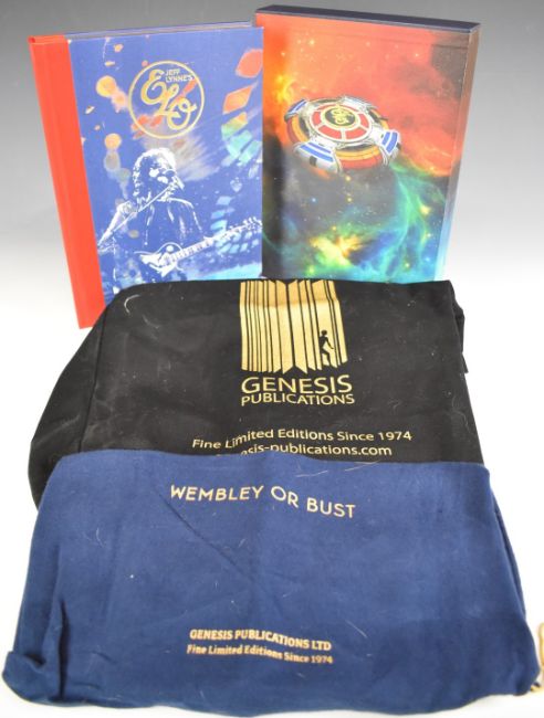 Wembley Or Bust; Jeff Lynne’s ELO Genesis Publications 2018, limited to 1500 numbered copies, signed by Jeff Lynne, a fully illustrated folio volume bound in gilt leather backed colour printed cloth boards and slipcase with printed cloth sack and publisher's cloth bag