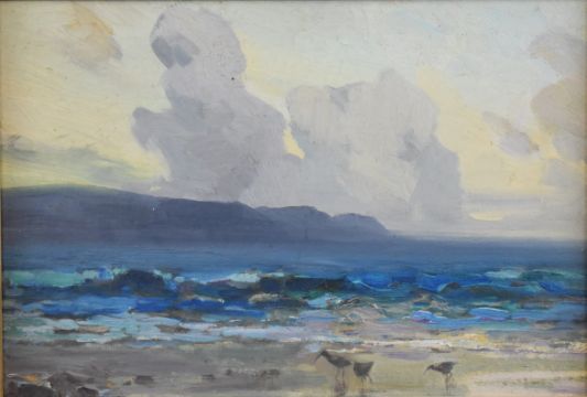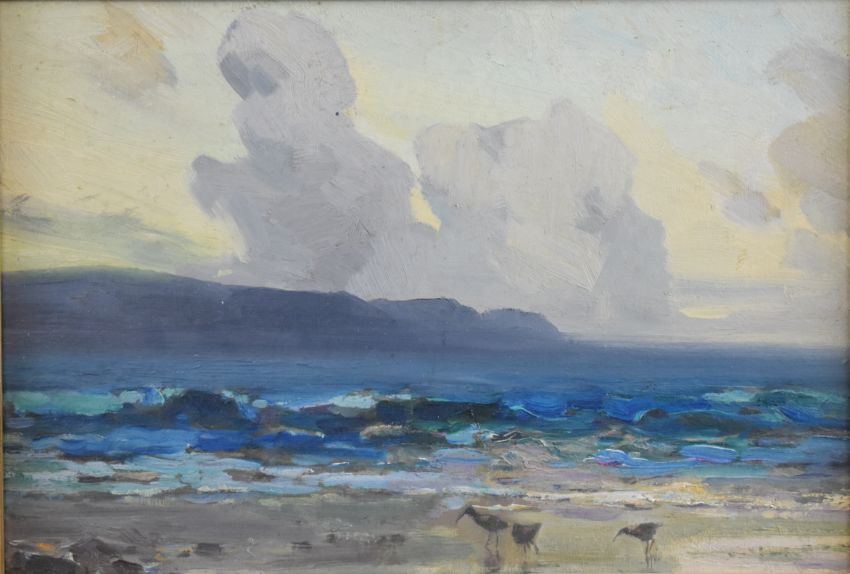 Alexander Carruthers Gould (1870-1948) oil on board Somerset coastal scene, Evening-Porlock bay looking towards Lynmouth, with wading birds to the foreground, 18.5 x 27.5cm, in ornate gilt frame, with label verso