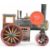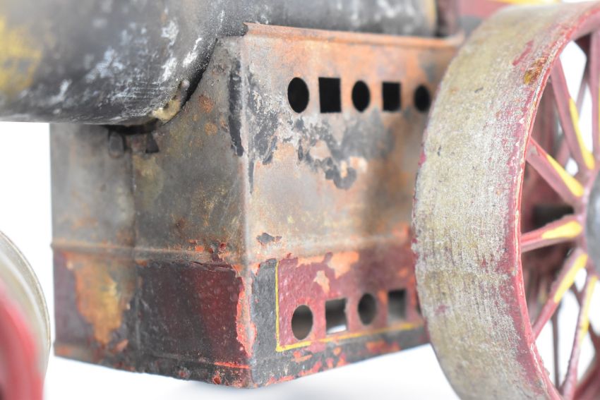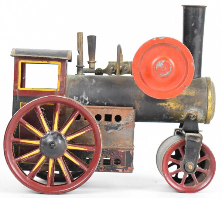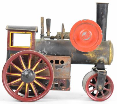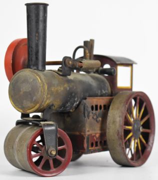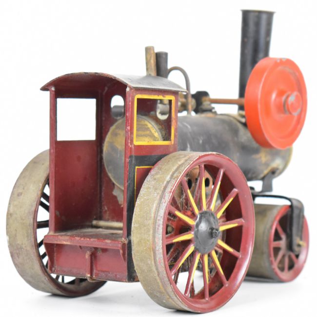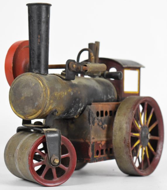 Likely Bing German made live steam roller in maroon, yellow and black with flywheel and burner, length 16cm.