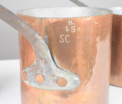 Set four copper saucepans, height of tallest 29.5cm