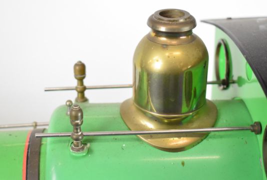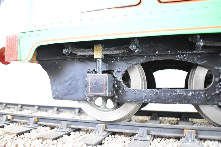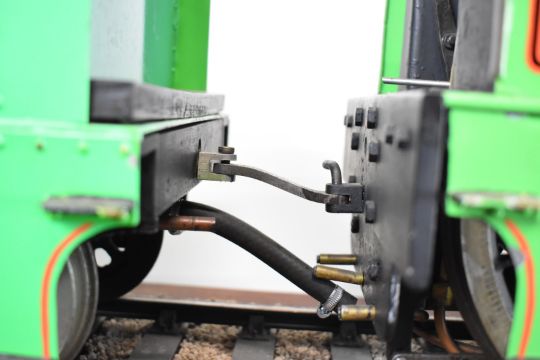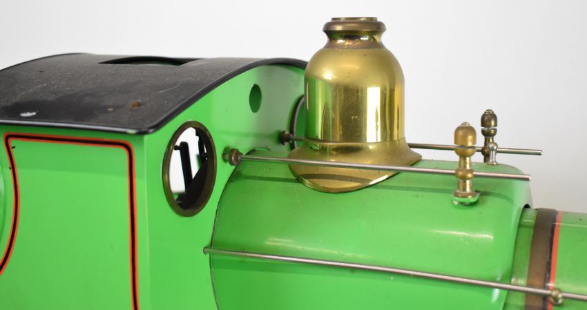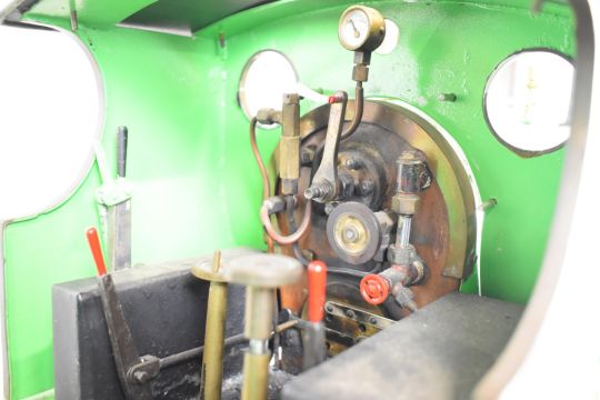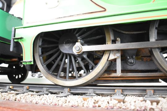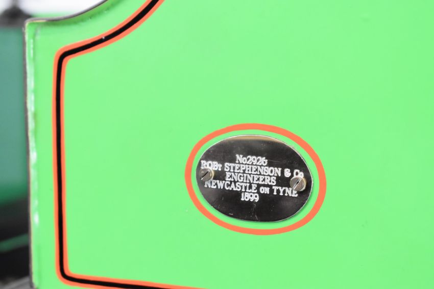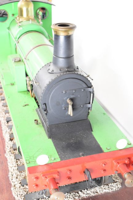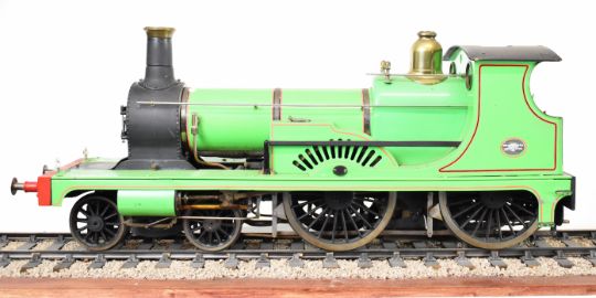LSWR or similar 5 inch gauge live steam 4-4-0 tender locomotive with copper boiler, Stephenson's link reversing valve gear, axle and hand feed pumps, steam whistle, water gauge glass, pressure gauge and cab operated cylinder drain cocks, on display track, overall length of loco and tender 153cm