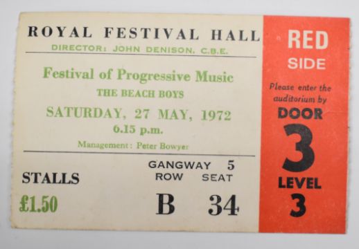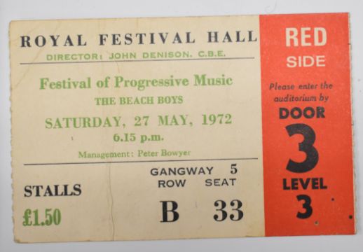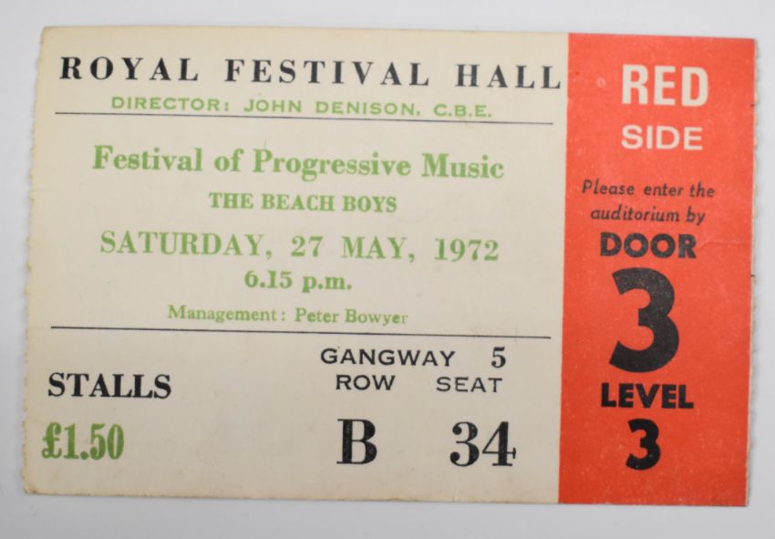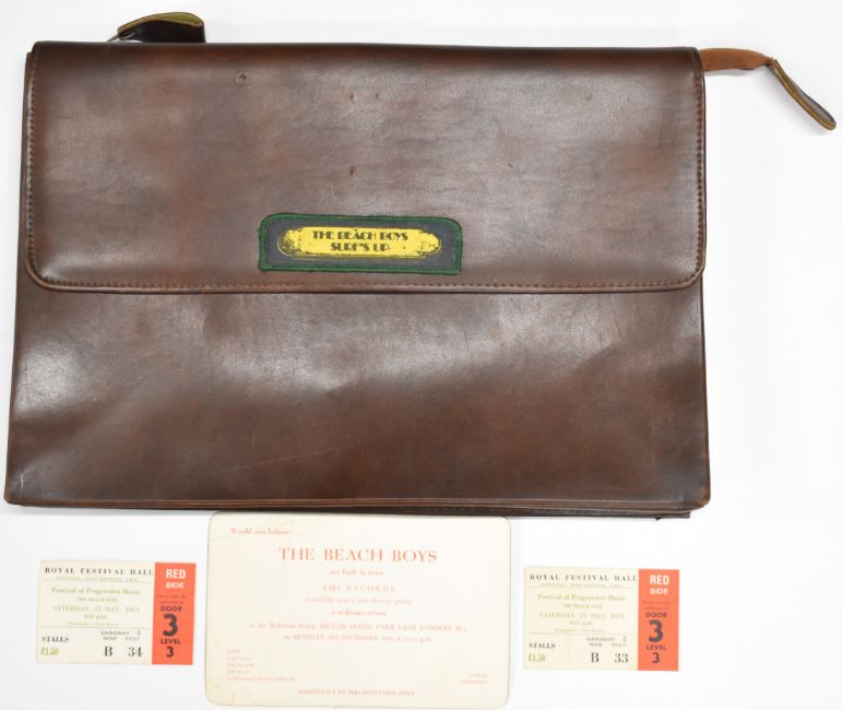 The Beach Boys Are Back in Town 1967 invitation from EMI records to the Hilton Hotel, two tickets for The Beach Boys at Royal Festival Hall 1972 and a leather 'Beach Boys, Surfs Up' attaché case. From the estate of music journalist Miranda Ward