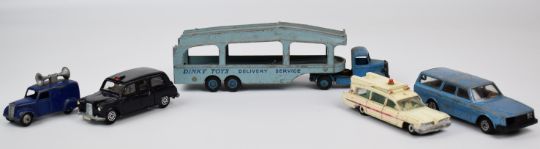 Over thirty loose Dinky diecast model cars and trucks to include Routemaster Bus, SRNG Hovercraft, Superior Criterion, Austin Taxi, Volkswagen Beetle, NCB Electric Van and Express Horse Box.