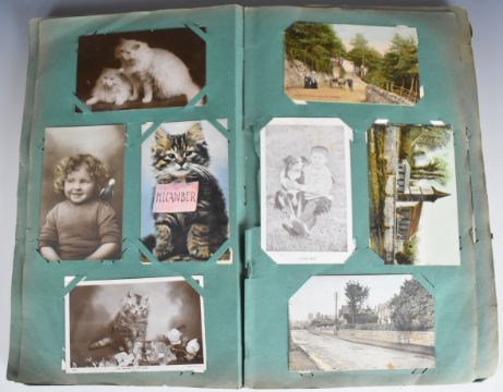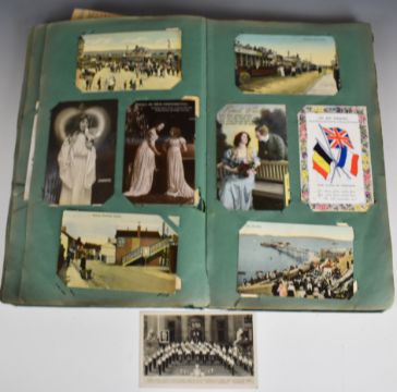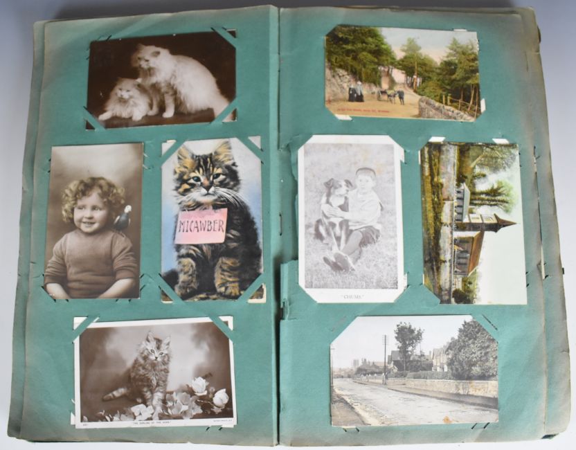Edwardian postcard album including Bristol Clifton, Symonds Yat, Lydney, Clevedon, Devon, Gloucestershire, Brimscombe / Stroud canal, Bath, Chalford, Sharpness Dock, Amberley, shipping, North Petherton, Swansea Street Scenes, three Mumbles train, railway crossing Lydney, Pill Harbour, Royal Edward of Avonmouth, Victorian sentimentalism, approximately 400 cards