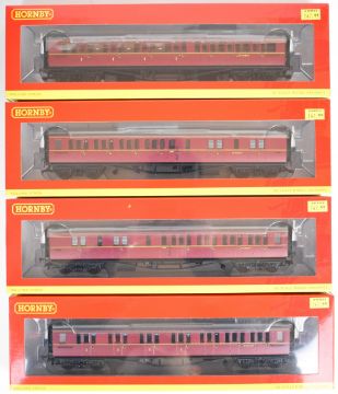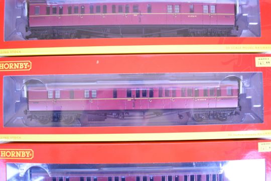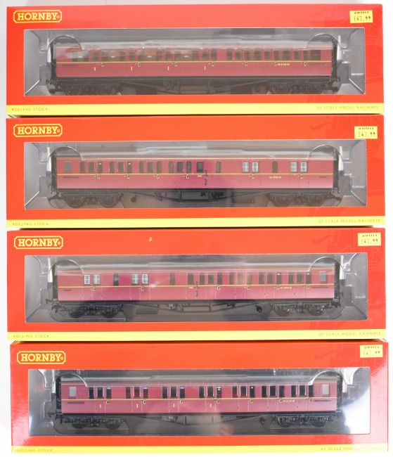 Four Hornby 00 gauge model railway BR maroon Collett coaches, all in original boxes