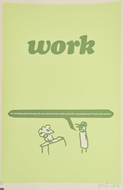 Modern Toss 'Work' signed limited edition 191/200 screen print with P.O.W blind stamp lower left and signed Jon / Mick 06 lower right and Pure Evil 'Ebay Result' signed limited edition 18/100 screen print, both 50 x 35cm, unframed