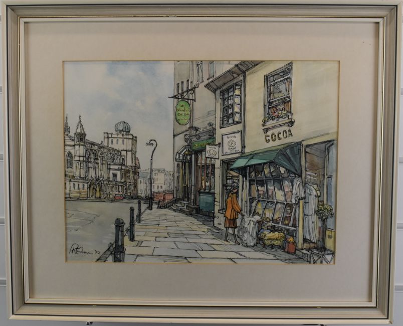 R.C. Francis pen, ink and wash Cheltenham, Gloucestershire street scene, signed and dated 92 lower left and with label verso, 28 x 38cm, in white painted and gilt frame