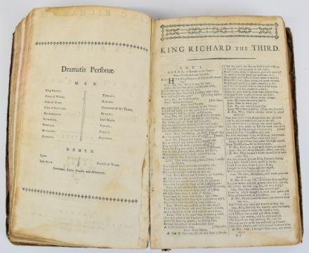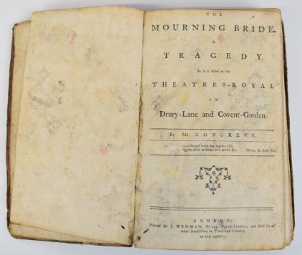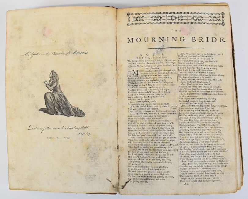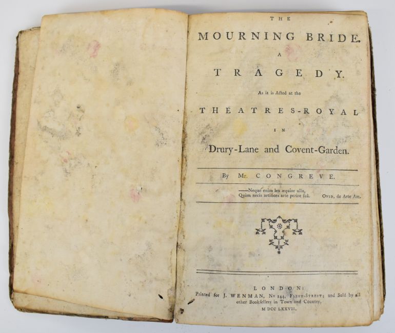 [Tragedies & Comedies] William Shakespeare, a Group of Eight plays as performed at Drury Lane and Covent Garden in one volume printed by J. Wenman 1777-1778 comprising King Richard III; Romeo and Juliet; The Tempest; A Midsummer Night’s Dream; Much Ado about Nothing; King Henry VIII; The Merry Wives of Windsor; All’s Well, that Ends Well – with several engraved plates bound with Twenty-Two other plays by Congreve -The Mourning Bride; Henry Fielding – Don Quixote in England; Harry Carey – The Honest Yorkshireman; Thomas Otway – The Orphan; or The Unhappy Marriage; Mr. Dryden – All For Love; or The World Well Lost; Aaron Hill – Zara; Mr. Farquhar – The Beaux Stratagem; N. Rowe – Tamerlane and Lady Jane Gray; Richard Steele – The Conscious Lovers; Thomas Southern – Oroonoko; John Hughes – The Siege of Damascus; Mr. Gay – The What D’ye Call It; D. Young – The Brothers; Mr. Otway – Venice Preserv’d, or A Plot Discover’d; Mrs. Cibber – The Oracle; Samuel Foote – The Orators; Taste; The Minor; The Author; The Englishman In Paris; The Knights, bound in worn leather backed boards (bottom half of last page torn away)
