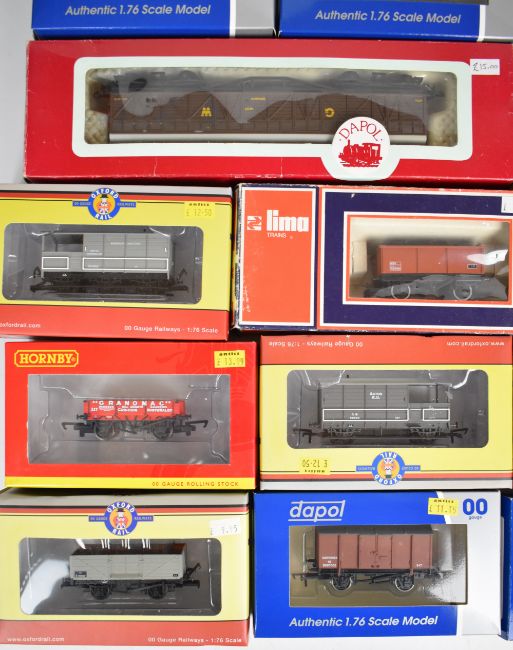 Nineteen Dapol, Hornby and Oxford Rail 00 gauge model railway goods wagons to include Gunpowder vans, Fruit D Siphon H and Toad brake vans, all in original boxes