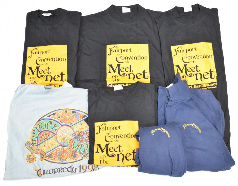 A collection of clothing and complementary tickets comprising Fairport Convention Cropredy Festival 1998 with compliment slips from Woodworm Records, five Fairport Convention Meet On The Net T shirts / sweatshirts and a further six Fairport Convention shirts including Cropredy 1999. From the estate of music journalist Miranda Ward