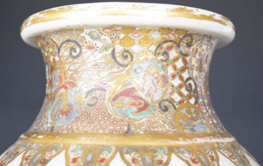 Pair of Japanese Satsuma vases decorated with figural scenes, with gilt rims, 45cm tall.