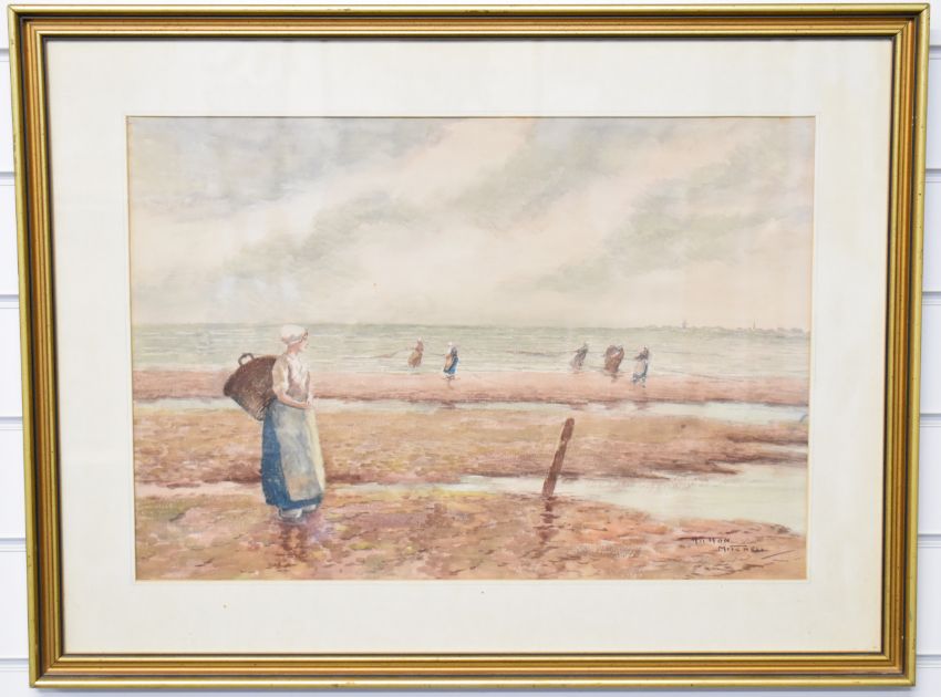 Hutton Mitchell (1872-1939) watercolour beach scene with nets being drawn in and lady with basket in the foreground, signed lower right 37 x 54cm, in gilt frame