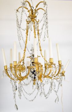 Ornate 19th century style gilt metal and cut glass ten branch chandelier or electrolier, with candle style bulb holders, diameter 55cm