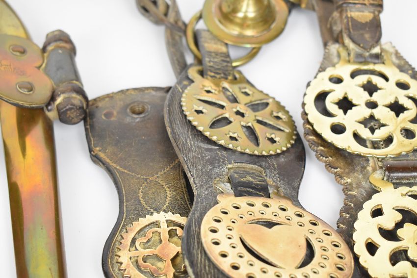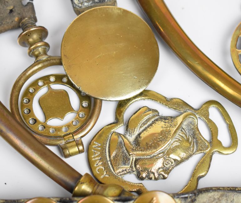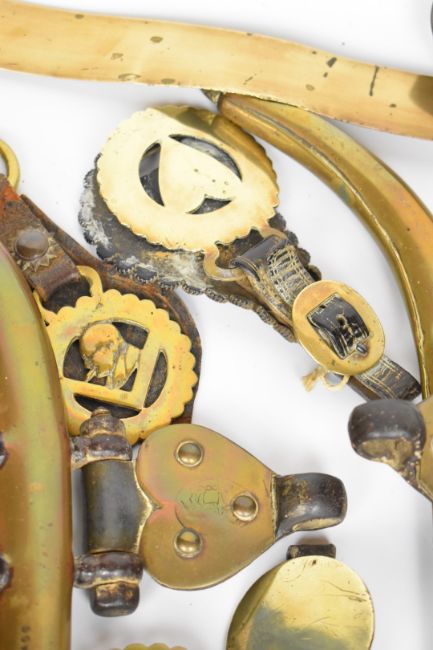 19thC horse brasses, most on leather straps, pair of horse hames, ringer etc