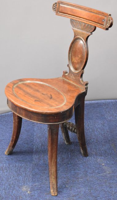 Three Georgian mahogany hall / footman's chairs with shaped seats, moulded splats and unusual narrowly spaced rear legs with bobbin stretchers