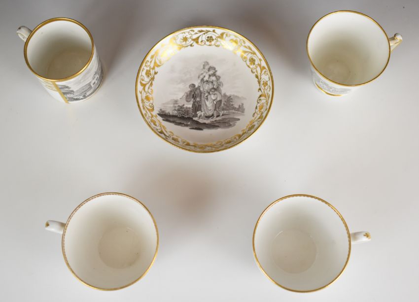 Four Spode bat print teacups / coffee cans and a saucer, some with Worlock Collection label to base