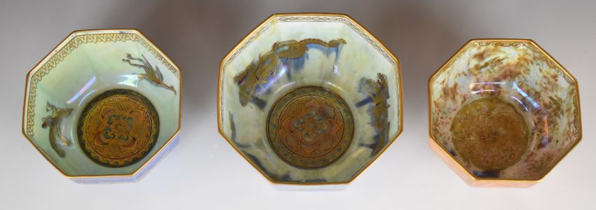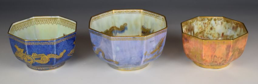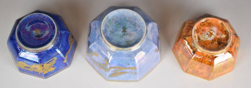 Wedgwood lustre ware three pedestal octagonal bowls decorated with dragons, Dogs of Fo etc, tallest 7cm