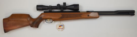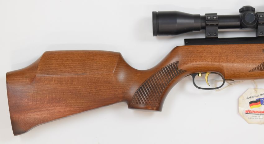 Weihrauch HW97K .22 underlever air rifle with patterned semi-pistol grip and forend, raised cheek piece, adjustable trigger and Edgar Brothers 6x44 scope, serial number 2379859, with original tag.