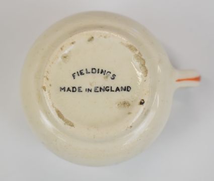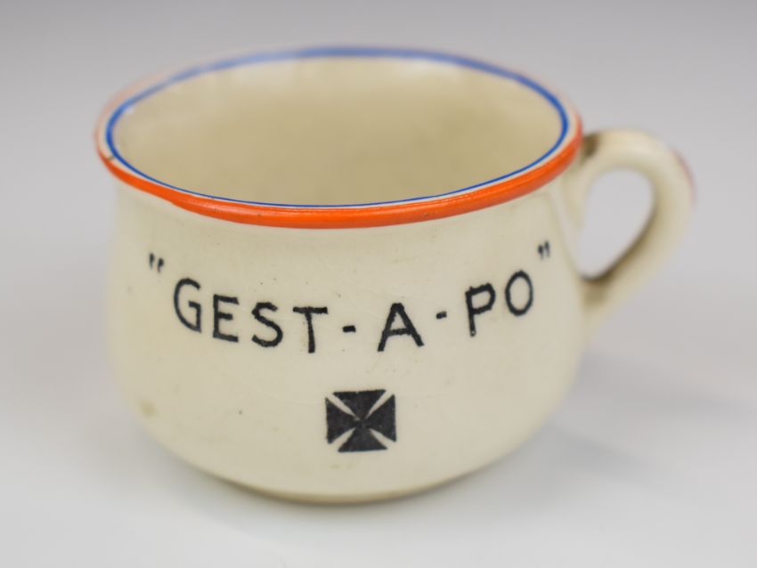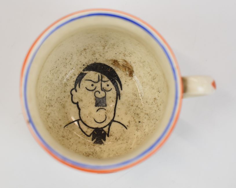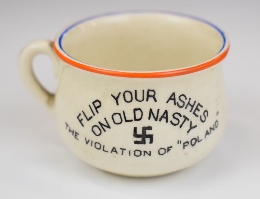 Fieldings small novelty ash pot, 'Flip Your Ashes on Old Nasty, The Violation of 'Poland' and 'Gest-a-po', the interior with a caricature of Hitler, height 3.5cm.