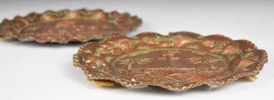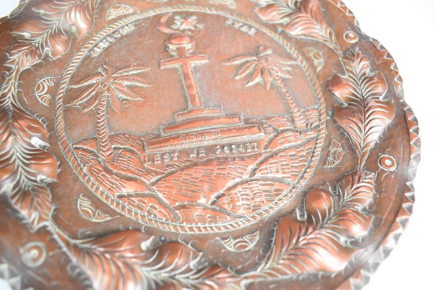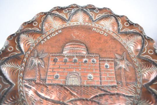 WW2 North Africa campaign interest pair of copper trench art wall plates, one titled African Star dated 1942 and with 'lest we forget' below, the other titled African Moon Algiers, with provenance verso; Leslie Norman Walker served in the 8th Army Pioneer Corps and commissioned an Italian gold and silversmith to make these for him, diameter 20.5cm
